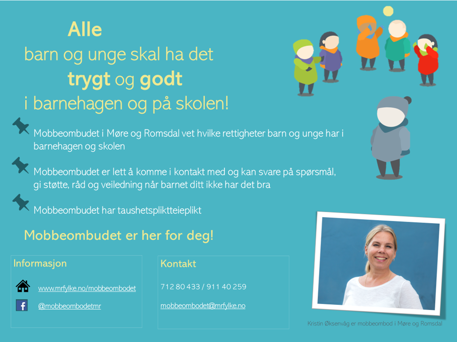 Mobbeombudet er en ombudstjeneste som skal sikre at barn og unge i Møre og Romsdal får en trygg og god hverdag i barnehagen og på skolen.