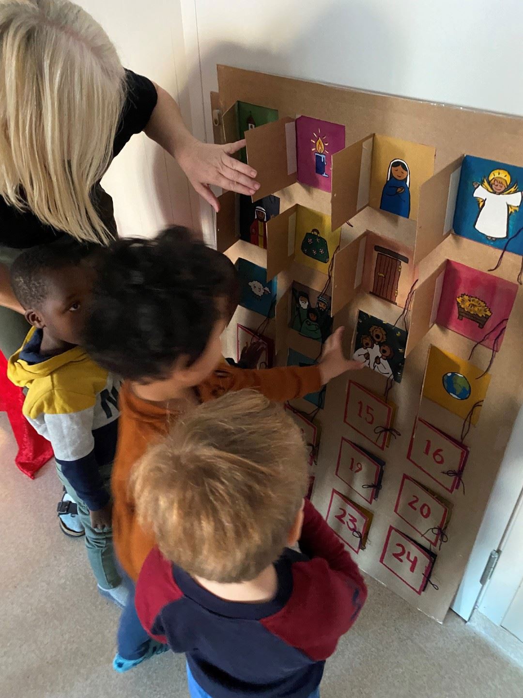 Vi fikk lov å sniktitte i mange av lukene, og vi så både engler og sauer der blant annet. Det var spennende å høre presten fortelle om juleevangeliet, og vi sang Et barn er født i Betlehem. Vi tente også det første lyset på advensstaken og sang det første verset av Tenn lys.