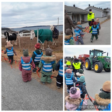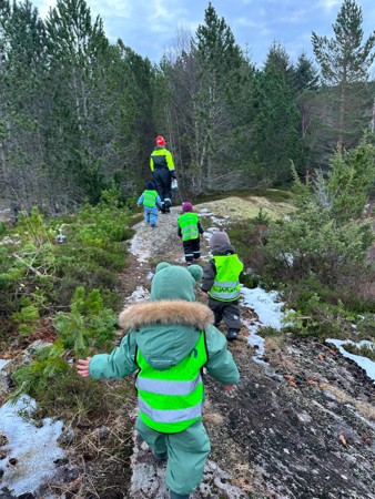 Vi har vært mye på tur. Hver avdeling har en turdag i uka, og noen ganger går de flere ganger. Vi har et veldig bra turterreng i rundt oss. De største klarer å gå opp på Røsandberget og helt ned til Kristvika, men vi har flere flotte turmål også nær barnehagen. Vi har en egen lavvo vi har fått sette opp i en glenne i skogen noen hundre meter bortenfor barnehagen, og lekeplassen i boligfeltet oppe på Røandåsen er også et veldig populært turmål. Noen hyggelige gårdbrukere i nabolaget lar oss også komme og hilse på dyrene deres. Vi trenger derimot ikke alltid gå utom gjerdet for å føle at vi er på tur, siden vi også har vår egen lille skog inne på området.