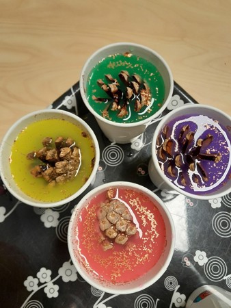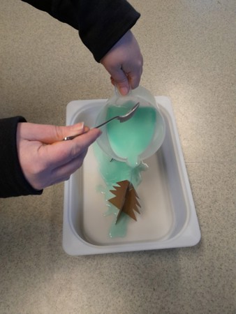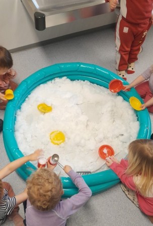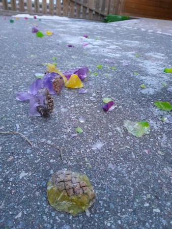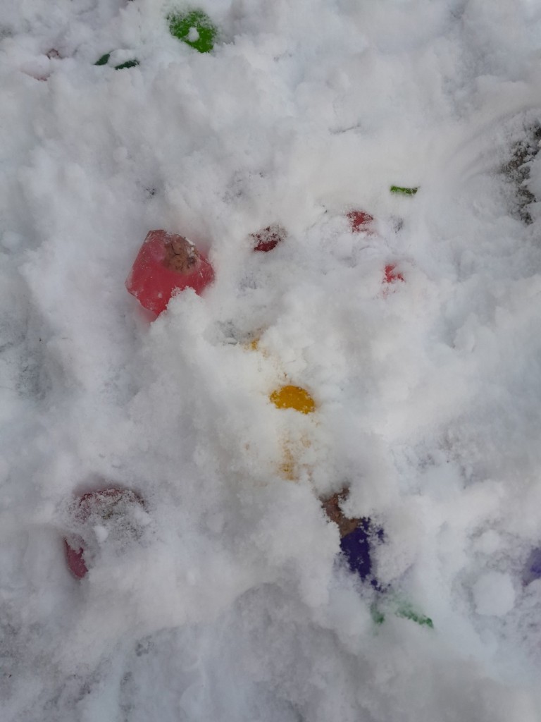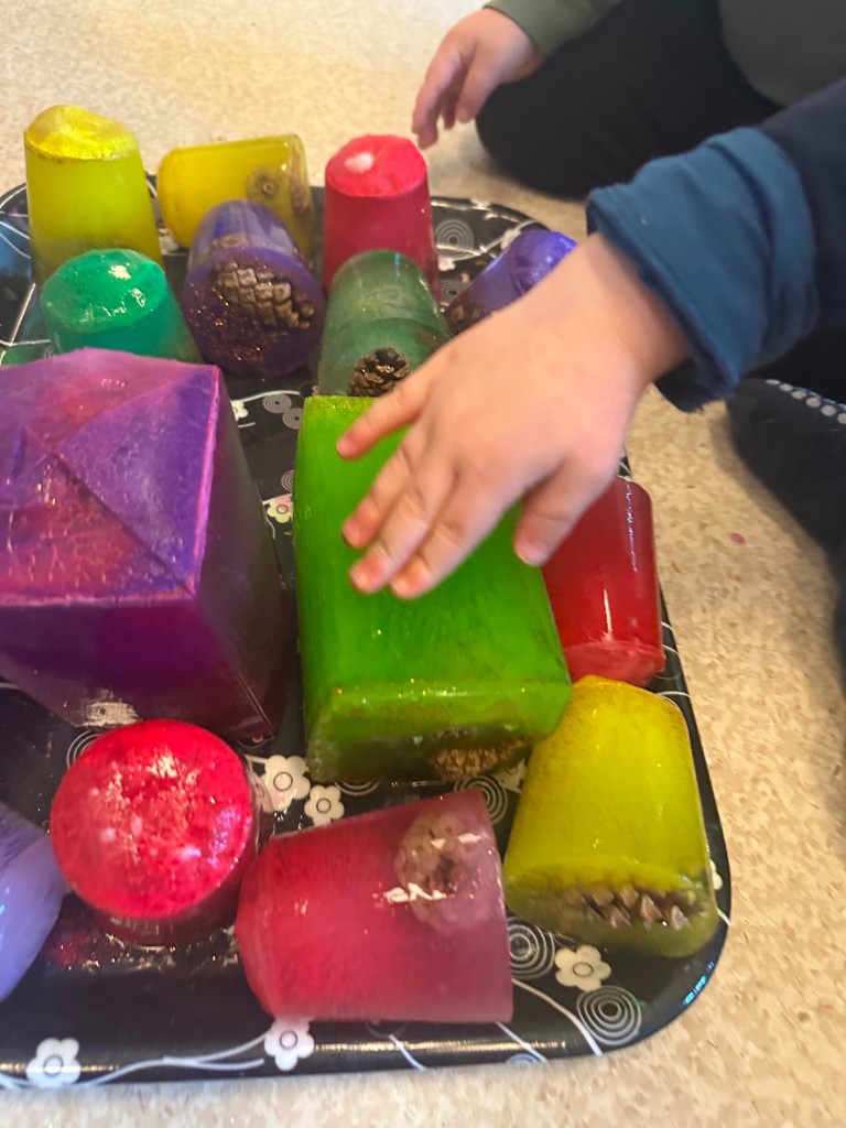 Her ser dere steg for steg hvordan to-åringene gjennomførte et prosjekt med vann, farger og naturmaterialer: De har blandet vann med materialer og farger, så har vi frosset det. Barna fjernet formene rundt vannet som nå var blitt til is, og vi beundret de vakre formene og fargene før vi tok de med ut og lekte med gjenstandene i snøen. Det var veldig spennende å kaste de på bakken slik at de knuste til slutt.