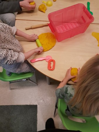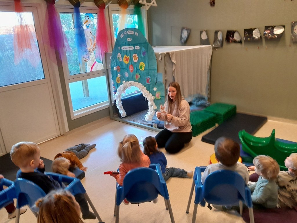 Avdelingene bruker også å jobbe med eventyr på denne tiden av året. Vi har da samlingsstunder der eventyrene blir fortalt og vi bruker konkreter og dramtisering når vi formidler. Dette foregår både ute og inne, og vi ser også at barna gjenopplever det de har hørt i leken sin etterpå.